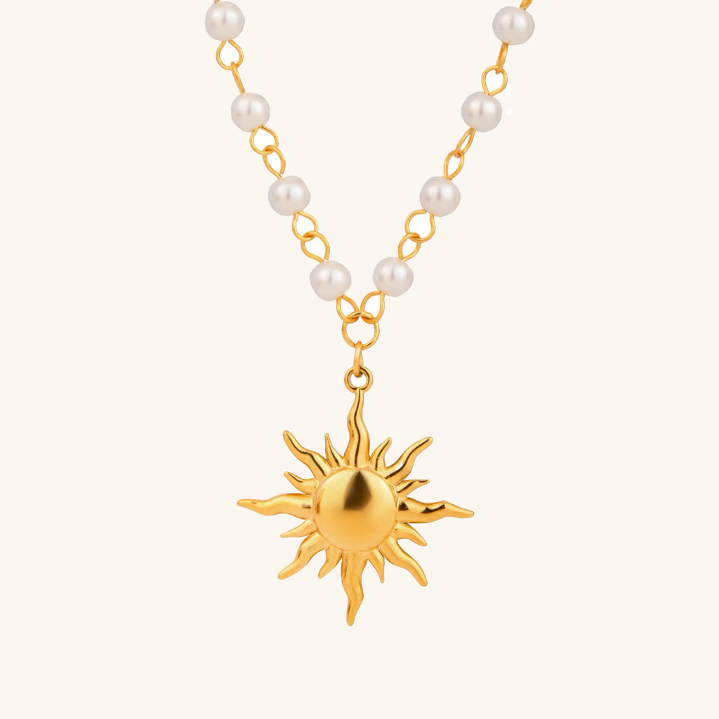 Elegant Pearl Necklace with Sun Pendant – Waterproof Freshwater Pearls, Adjustable 16 Inches, Hypoallergenic Design