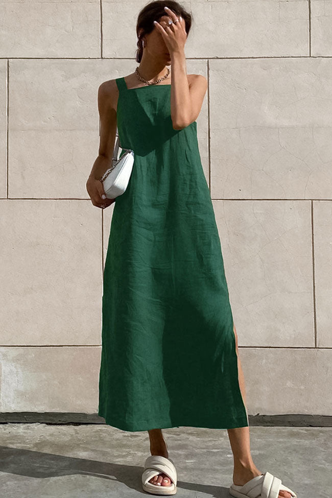 Women's Summer Midi Dress Green Linen Blend A-Line