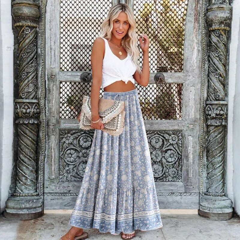 Women's Maxi Skirt Light Blue Floral Cotton Rayon Blend