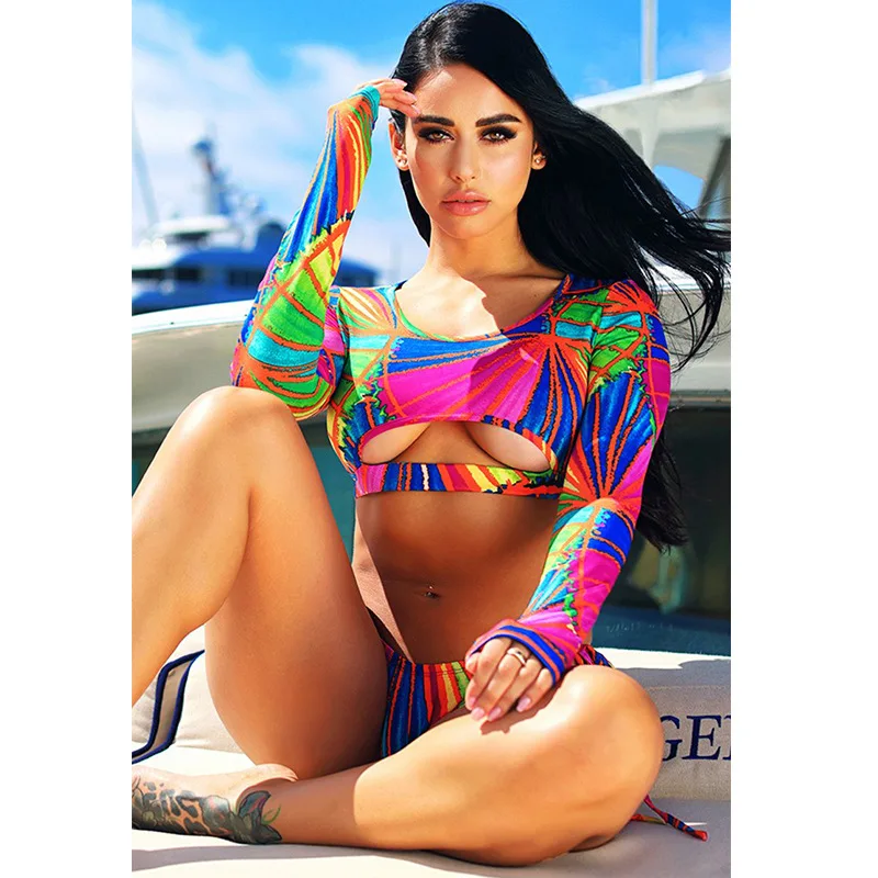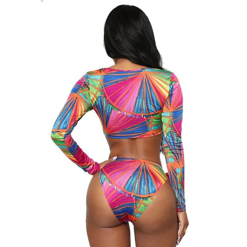 High Cut Swimsuit Two Piece Bathing Suit Women African Print Long Sleeves Swimwear Cut Out Beach Tribal Thong Bikini